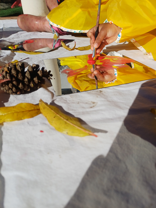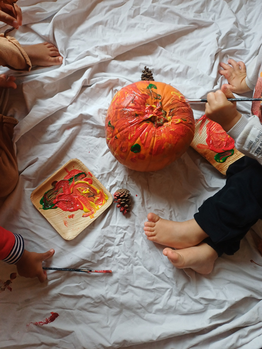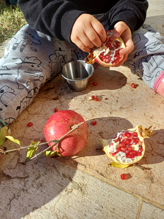 In questo autunno abbiamo assaggiato, manipolato, schiacciato, travasato, dipinto tutto quello che la natura ci ha offerto. Abbiamo cominciato con lo sgranare i melograni del nostro albero in giardino per poi proseguire con le pannocchie di mais che per ultime sono state raccolte dai campi e abbiamo giocato a travasare i piccoli chicchi gialli e la farina che se ne ricava. Le foglie che man mano si tingevano di giallo, rosso e arancione ci hanno ispirato nell’uso degli acquerelli su diversi materiali: prima uno specchio e poi un foglio di carta bianco. Abbiamo manipolato la pasta di sale fatta in casa insieme ai piccoli tesori che l’autunno ci ha regalato come: pigne, foglie colorate e castagne matte. Abbiamo manipolato, schiacciato e assaggiato la zucca cotta e i cachi e molte altre opportunità ci offrirà l’inverno che ormai è alle porte.