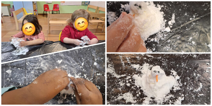 Partendo da materiali di uso quotidiano – schiuma da barba e bicarbonato – i bambini hanno creato una speciale neve artificiale, soffice, bianca e sorprendentemente simile a quella vera. Mescolando, toccando e osservando le trasformazioni della materia, hanno potuto sperimentare in prima persona come la scienza sia presente anche nelle piccole cose e possa diventare un gioco creativo.