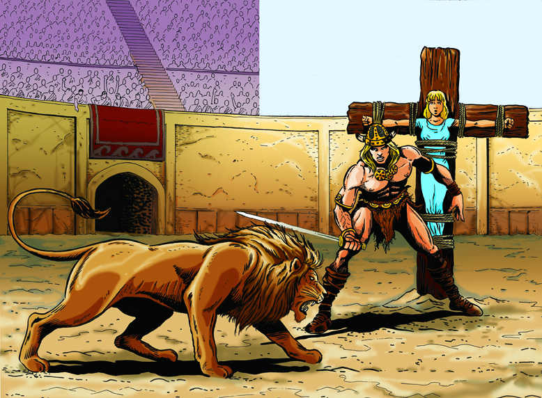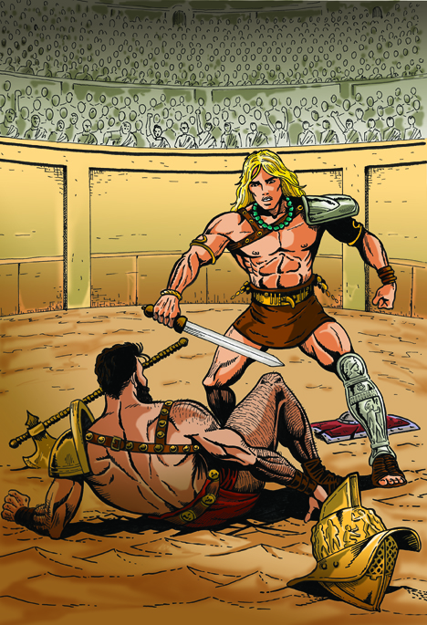 Furio raccolse il gladio, balzò sul gigante che cercava di rialzarsi e lo bloccò al suolo puntandogli l’arma alla gola. Ercole allargò le braccia: un’espressione mista di terrore e di stupore si dipinse nei suoi occhi: era vinto, non era mai capitato prima.