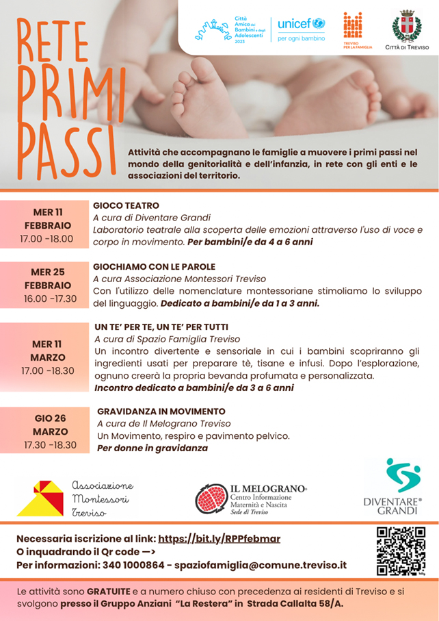 Tornano gli appuntamenti di Rete Primi Passi, un progetto promosso da Spazio Famiglia Treviso in collaborazione con enti e associazioni del territorio, per accompagnare famiglie, bambini e bambine nei primi passi nel mondo della genitorialità e dell’infanzia.