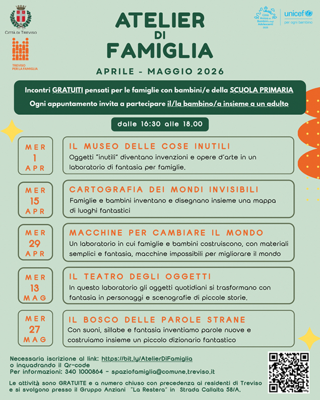Il percorso degli “Atelier di Famiglia”, iniziativa promossa dal Comune di Treviso (Assessorato alle Politiche Educative, Giovanili e Pubblica Istruzione) in collaborazione con lo Spazio Famiglia Treviso, è entrato nel vivo.