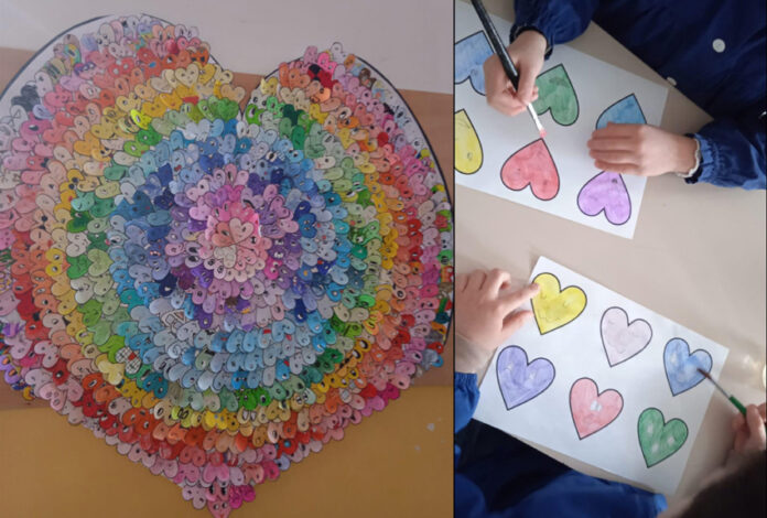 Riflettendo sulle caratteristiche che rendono le persone uniche e speciali, abbiamo avviato il laboratorio creativo: ispirandoci allo stile dell’artista Chris Uphues, gli alunni hanno realizzato 6 piccoli cuori dai colori e dalle espressioni differenti, utilizzando diverse tecniche di coloritura. Una volta ritagliati, i piccoli cuori sono andati a comporre un’opera collettiva che li ha raccolti tutti all’interno di un cuore più grande; abbiamo così ammirato come le diversità e le particolarità che ci contraddistinguono possano incontrarsi e, insieme, andare a comporre un quadro variopinto e ricco, in cui ognuno può trovare spazio per esprimere la propria originalità.