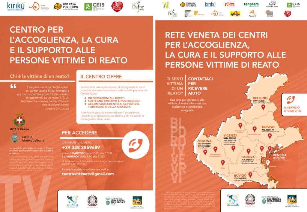 Il Centro per l’accoglienza, la cura e il supporto alle persone vittime di reato ha l’obiettivo di fornire un primo orientamento a quanti abbiano subito un reato e necessitino di un supporto per reagire al fatto illecito subìto, ovvero tutte le persone che abbiano subìto un danno fisico, mentale-emotivo, o perdite economiche, causato direttamente da un reato. A questi, ma anche ai loro familiari o a quanti a loro vicini abbiano subìto i riflessi negativi di tale fatto, si rivolge lo sportello nella sede del Comune di Treviso in via Dalmazia 17, a cui si accede su appuntamento, anche perché – in base alla provenienza geografica di chi intende usufruirne – è possibile essere accolti e ascoltati anche nelle sedi delle cooperative coinvolte. Per accedere al servizio è infatti necessario contattare il numero 328 2859689 tutti i martedì dalle 15 alle 17 e tutti i venerdì dalle 9 alle 11, o in alternativa scrivere via mail a centrovittimetv@gmail.com.