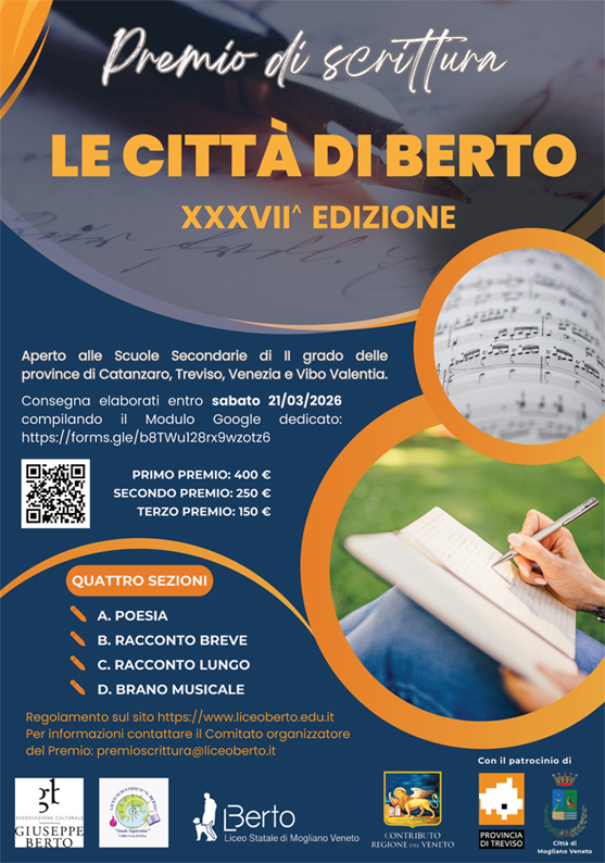 Le opere devono pervenire entro e non oltre sabato 21 marzo 2026 in copia digitale. Il Regolamento è consultabile nel sito www.liceoberto.edu.it/le-citta-di-berto, mentre per qualsiasi informazione si può contattare il Comitato organizzatore del Premio (premioscrittura@liceoberto.it).