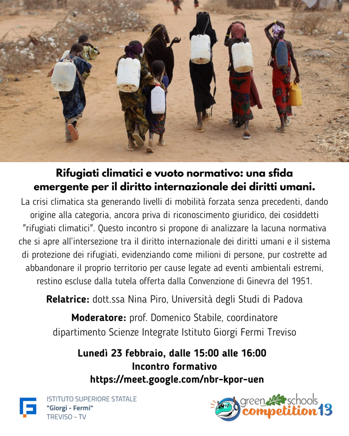 All’interno delle attività formative per i docenti e gli studenti dell’istituto della Green Schools Competitions, l’Energy Team della nostra scuola ha organizzato un incontro online dal titolo: “Rifugiati climatici e vuoto normativo: una sfida emergente per il diritto internazionale dei diritti umani”, con la dottoressa Nina Piro.