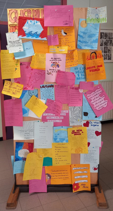 Durante la mattinata, per questa occasione, sono stati posizionati in ogni piano dei pannelli nei quali sono stati appesi i cartoncini che hanno così innalzato un vero muro poetico e colorato.